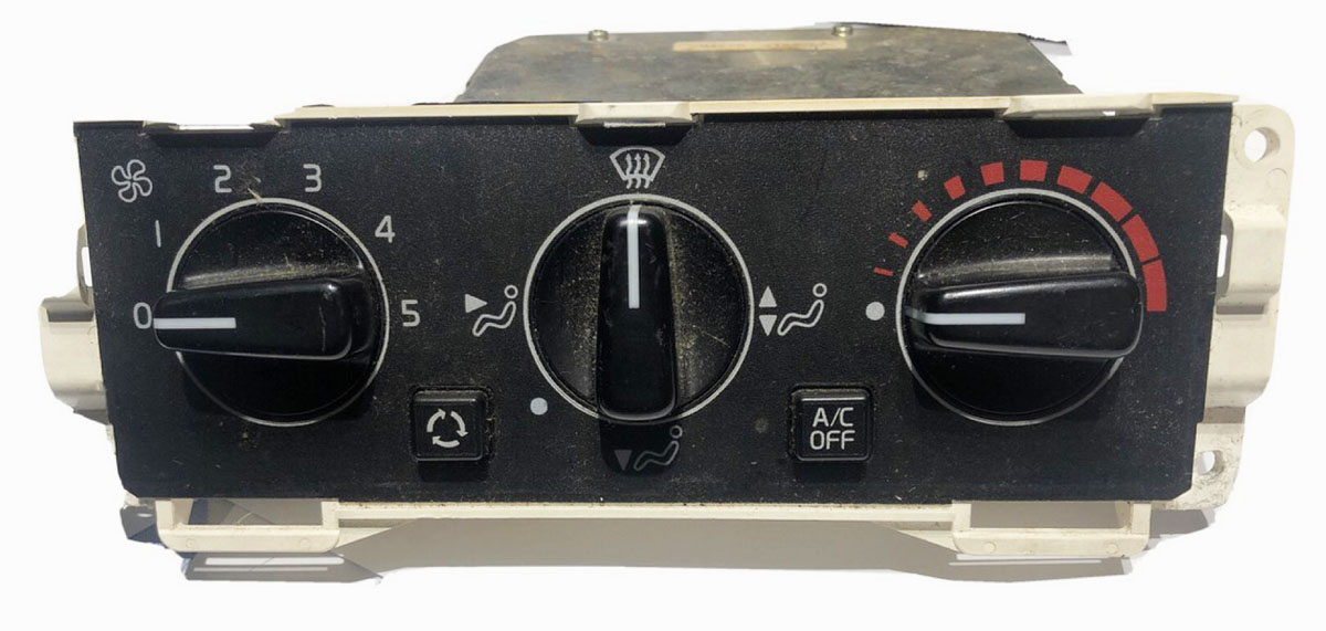 An aftermarket reproduction heater control valve with a metal vacuum motor for cars with a manual heater control panel. We are showing a picture of what a manual heater control panel looks like. It is in most of the 700 and 900 series cars. Unless your heater control has the word AUTOMATIC, printed on the faceplate, this heater control valve is for you.